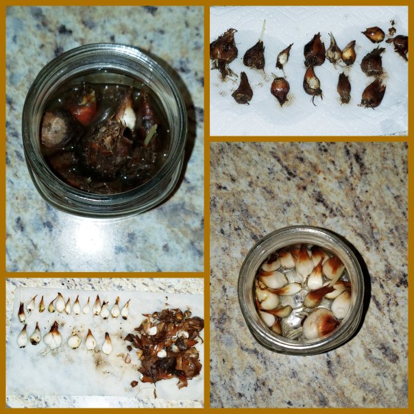 Once I had taken as much as I could off , you could see the difference in the 3rd and 4th picture. I ended up with more than I started with, 18 to be exact. Though some of the rotteness was still visible the bulbs still has potential to grow. Look how clear the water is now.